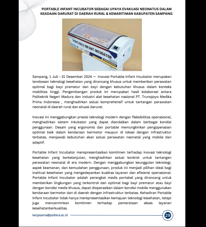 Melalui kerja sama ini, PT. Trunojoyo Medika Prima Indonesia berperan dalam aspek industri, regulasi, produksi, dan komersialisasi, sementara POLTERA Sampang berkontribusi pada riset, desain, rekayasa, dan pengujian teknis. Pengembangan inkubator portable ini diharapkan mampu mendukung penanganan bayi baru lahir, terutama pada kondisi darurat dan layanan kesehatan rujukan.