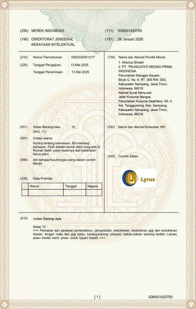 Merek LYRUS® telah terdaftar pada Direktorat Jenderal Kekayaan Intelektual (DJKI), Kementerian Hukum Republik Indonesia, dengan rincian sebagai berikut: