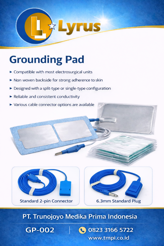 LYRUS Grounding Plate adalah elektroda balik (return electrode) yang digunakan pada prosedur bedah elektrokauter/diatermi untuk mengembalikan arus listrik dari tubuh pasien menuju generator electrosurgical. Dirancang untuk memastikan keamanan pasien, mengurangi risiko luka bakar, dan mendukung performa alat bedah listrik secara optimal.