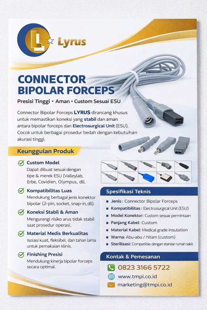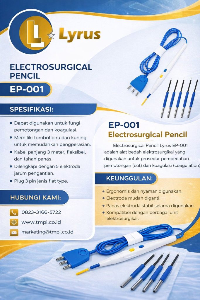 LYRUS Electrosurgical Pencil adalah perangkat elektrokauter berkualitas medis yang dirancang untuk mendukung prosedur pembedahan dengan presisi, efektivitas, dan keamanan tinggi. Produk ini diproduksi oleh PT. Trunojoyo Medika Prima Indonesia dengan standar mutu terkontrol serta menyesuaikan kebutuhan tenaga medis di berbagai fasilitas layanan kesehatan.